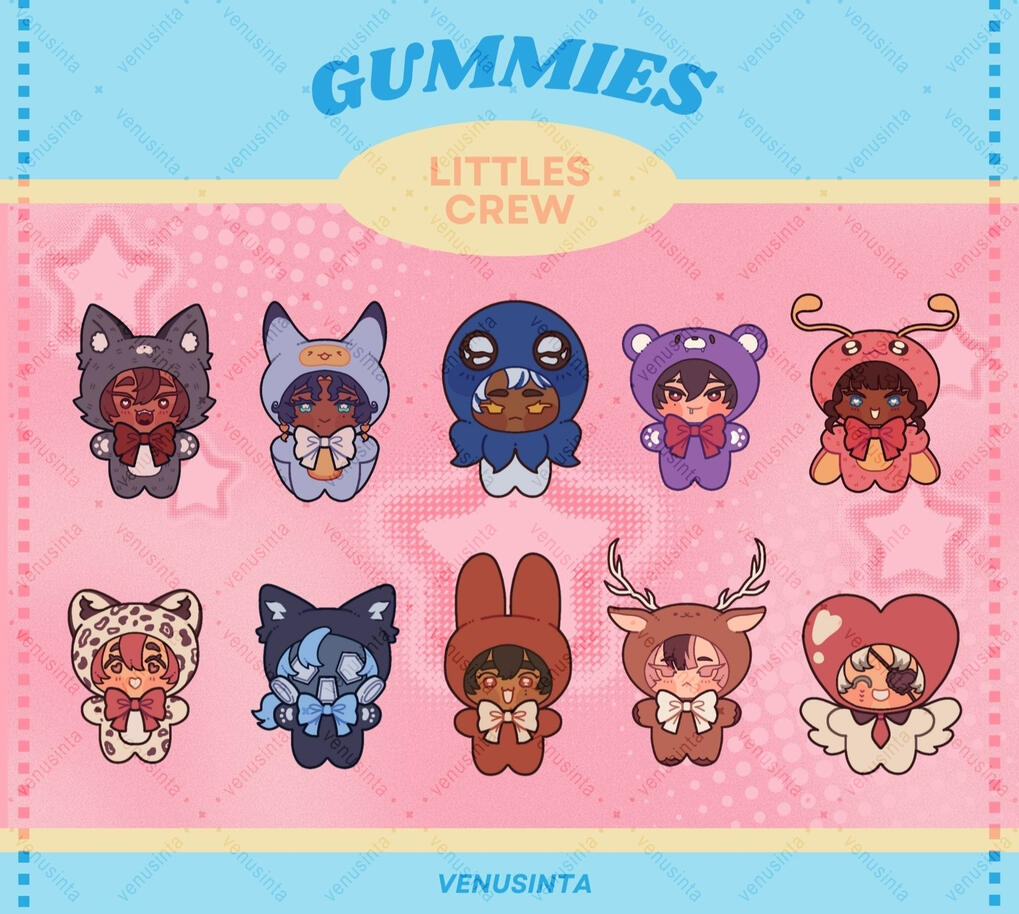 Small cheebs made with sugar and gelatin, ready for squishing!All gummies are drawn in a onesie. Provided to you as a transparent png.